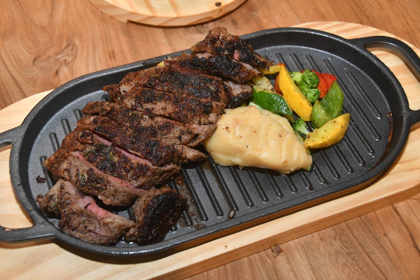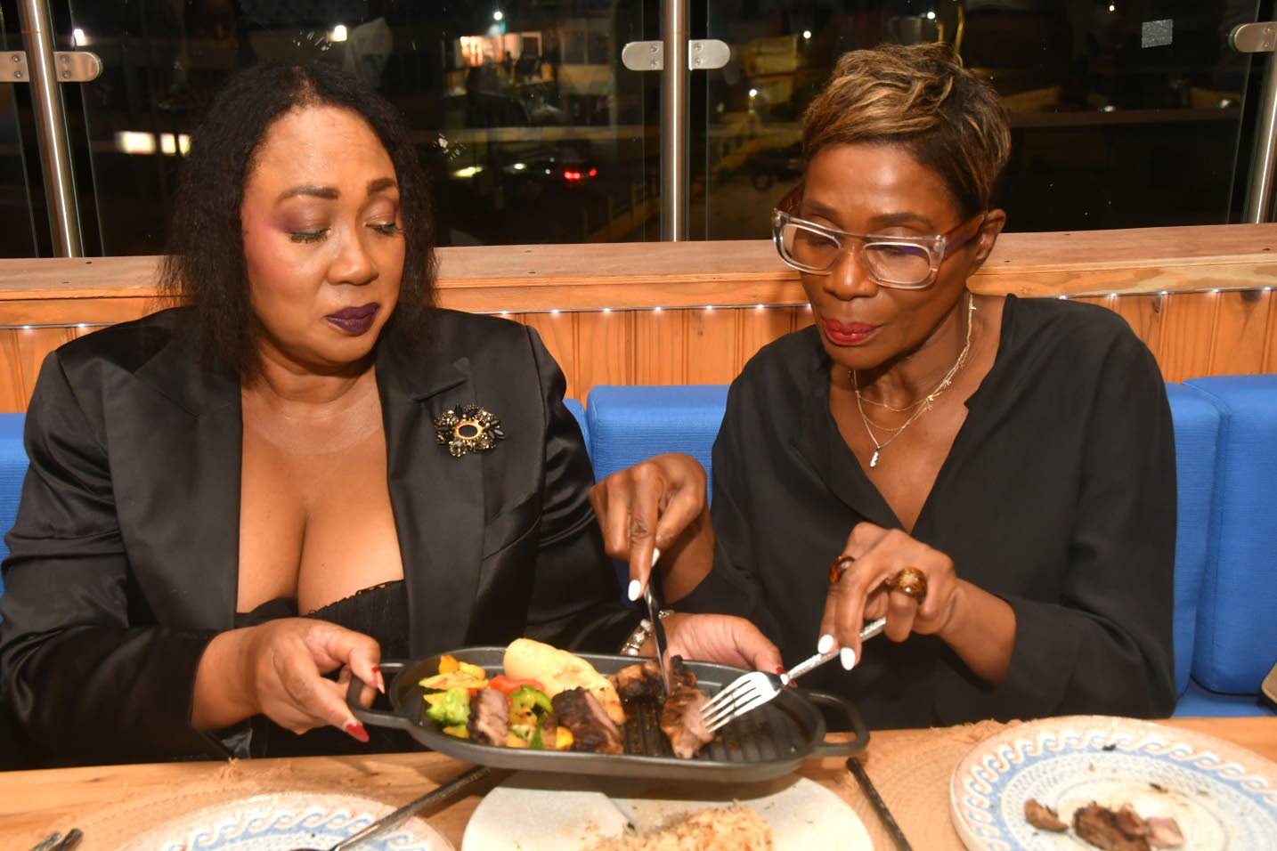 Jamaica Observer Table Talk Food Awards judge Norma Williams (left) steadied the prime New York strip steak as Jamaica Observer Table Talk Food Awards conceptualiser Novia McDonald-Whyte helped herself to a slice. (Photo: Garfield Robinson)