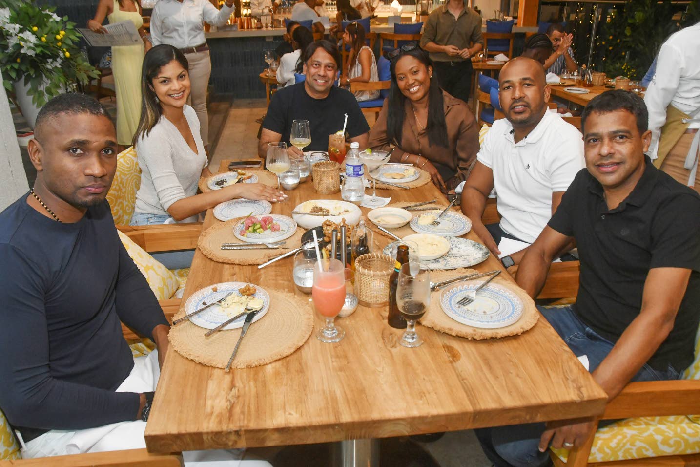 Enjoying the fare seated alongside Food Awards Chair Novia McDonald-Whyte (third left) were Shikima Hinds (left), Shikima Hinds Events Concierge managing director; Jamaica Observer Table Talk Food Awards judges Norma Williams (second left); Kadean Vendryes (third right); Professor Lloyd Waller; and Mala Morrison. Supervising the service were Mezza Luna managers Dixit KumarJha (left), Tatianna Hurtado (centre), and principal Karina Mahbubani. (Photo: Garfield Robinson)