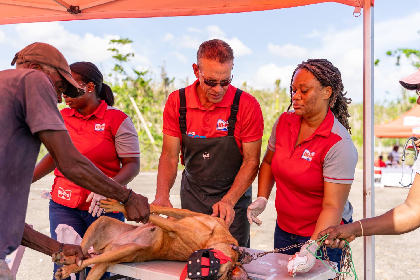 Hi-Pro veterinarians (from left) Tashira Graham, Michael Motta, and Roberta Harris-Daley attend to a dog with an ear injury at Bunkers Hill Community Centre, with the owner helping to safely restrain the pet, during the company’s Hurricane Melissa vet clinic.
