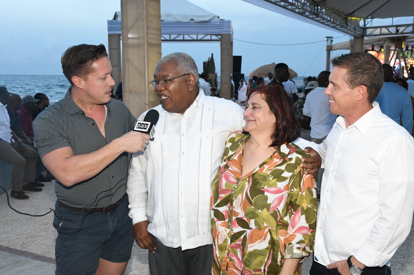 Managing Editor at PAX News Michael Pihach (left) conducts an interview with birthday celebrant Gary Sadler (second left) and his guests Trevello Group, Canada CEO Zeina Gedeon, and Sandals Resorts International Executive Chairman Adam Stewart. Joseph Wellington