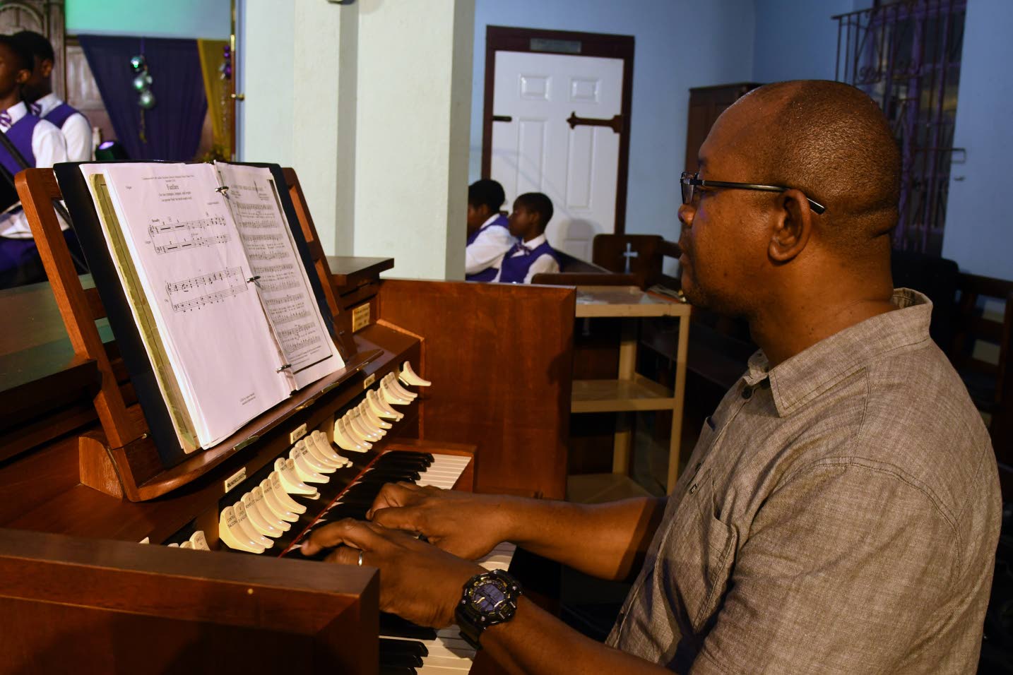Organist Livingston Burnett on the chapel’s pipe organ during the singing of Hark The Herald Angels Sing, in the audience joined. (Photo: Karl Mclarty)