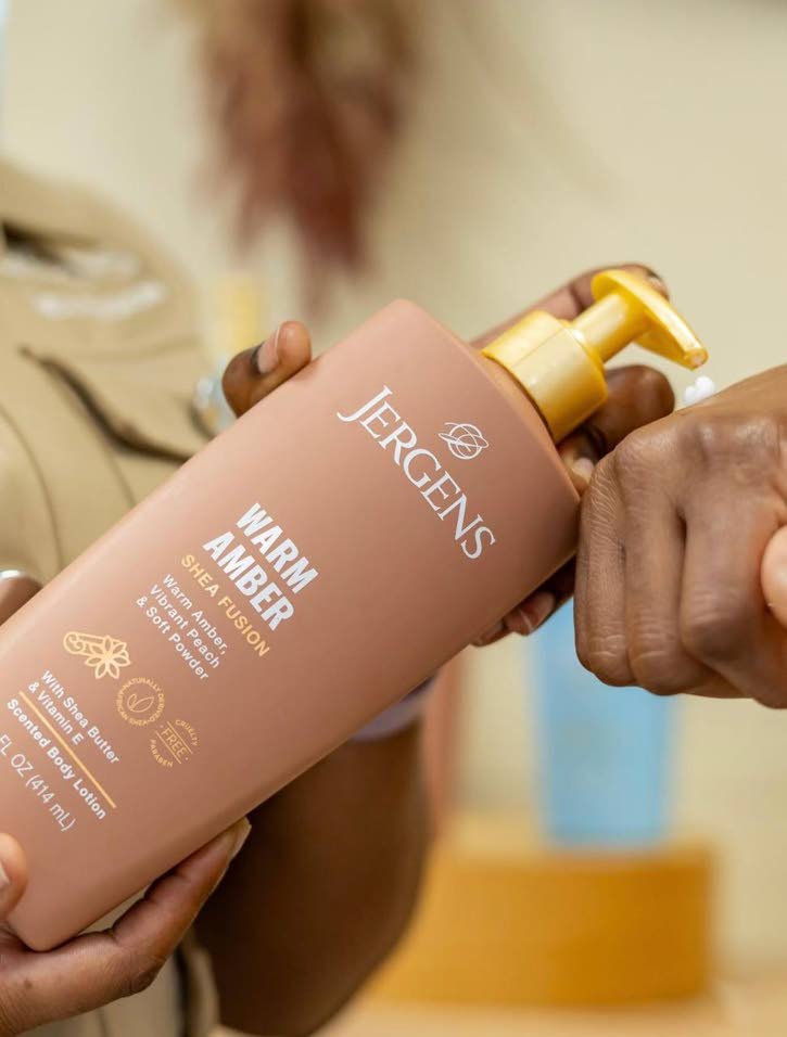 Jergens Shea Fusion Warm Amber Body Lotion brings the warm scent of amber, soft powder, and vibrant peach to touchable nourishing moisture.
