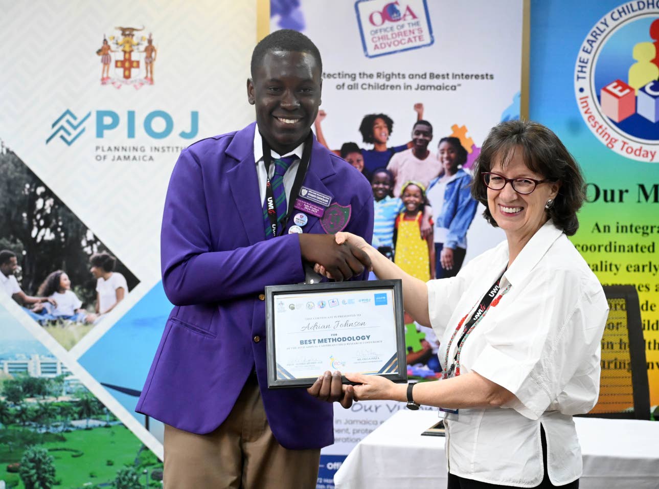 For his research paper, Adrian Johnson (left), student at William Knibb Memorial High School in Jamaica, receives his certificate for Best Methodology from Olga Isaza, UNICEF Representative for Jamaica and the Eastern Caribbean, during the recent Caribbean Child Research Conference held at The UWI Regional Headquarters.