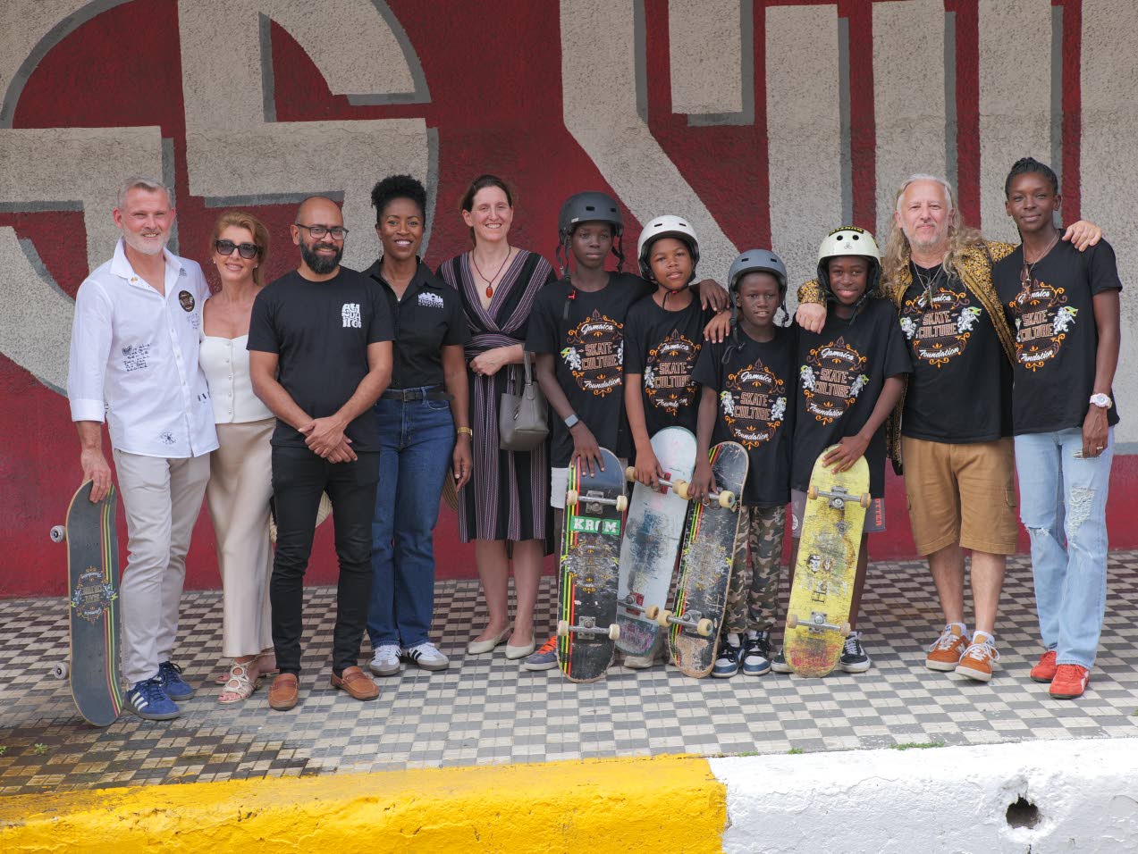 Sharing the frame at the festival were (from left) German Ambassador to Jamaica Jan Hendrik van Thiel and his wife Marina Siniavskaia; University of Technology’s (UTech) Andre Bowen; Andrea Dempster Chung, Kingston Creative executive director; French Ambassador to Jamaica Marianne Ziss; EduSkateme team members Tariq Davis, Jaiquan Dillon, Shemel Swady, and Ramese Wright; and Jamaica Skate Culture Foundation co-principals Remy Walter and his Kimberley Harris.Oh Zeen Entertainment