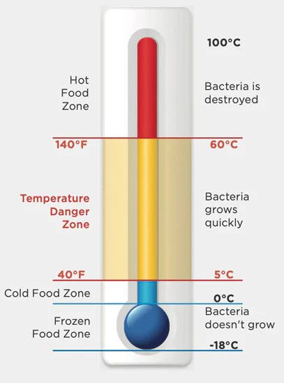 The temperature range between 5°C and 60°C is known as the Temperature Danger Zone. This is because in this zone food poisoning bacteria can grow to unsafe levels that can make you sick.
