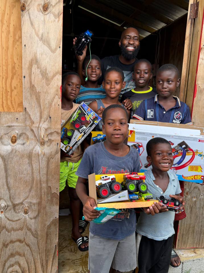 Aiden (front left), whose request helped spark the Joy Drive initiative, is pictured with Adiel (also known as King Diel) and other children during the gift distribution. The initiative aimed to bring joy and a sense of normalcy to children in western Jamaica during the Christmas season.