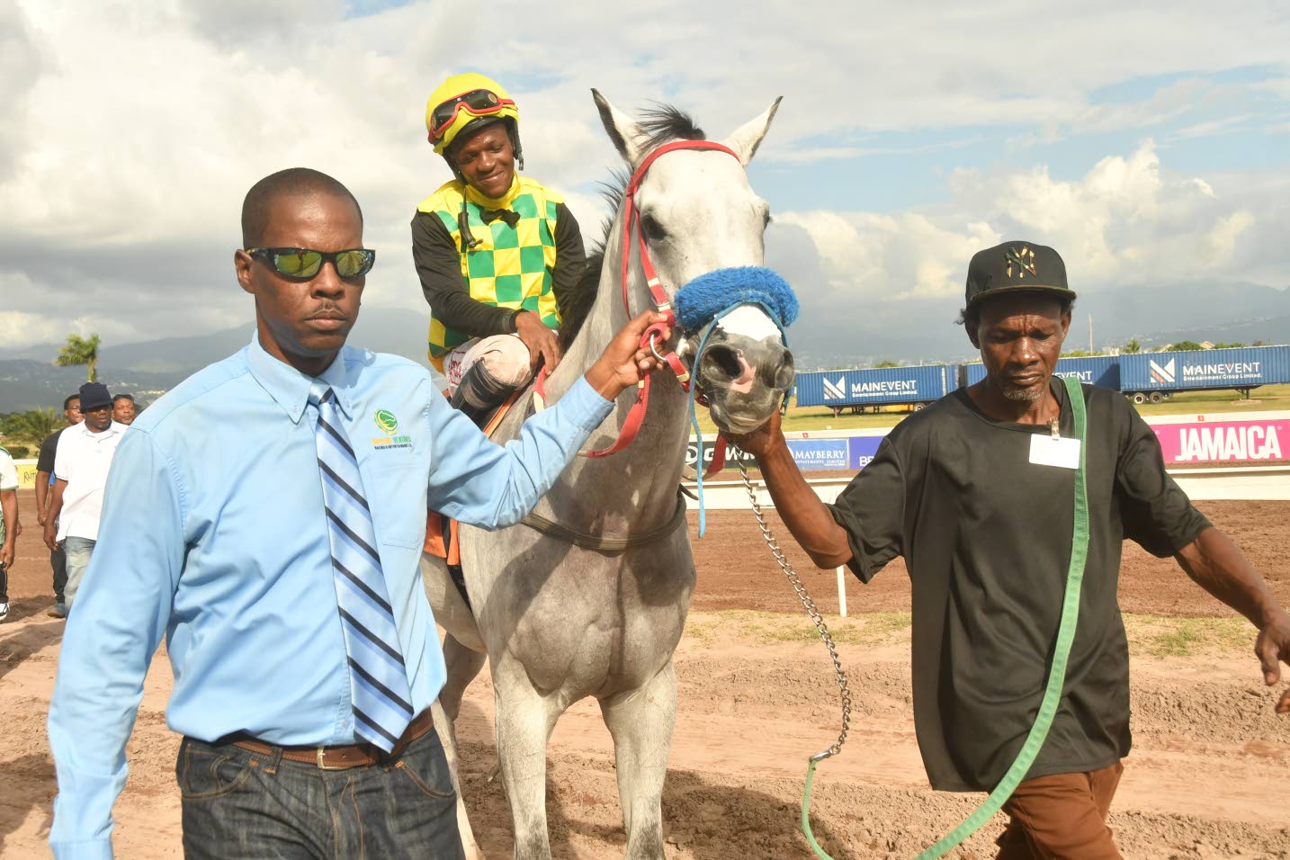 Trainer Michael Cain Jr (left) and groom Ocon McCollin lead in Restoration (Jaheim Anderson) to the winners’ enclosure. Garfield Robinson