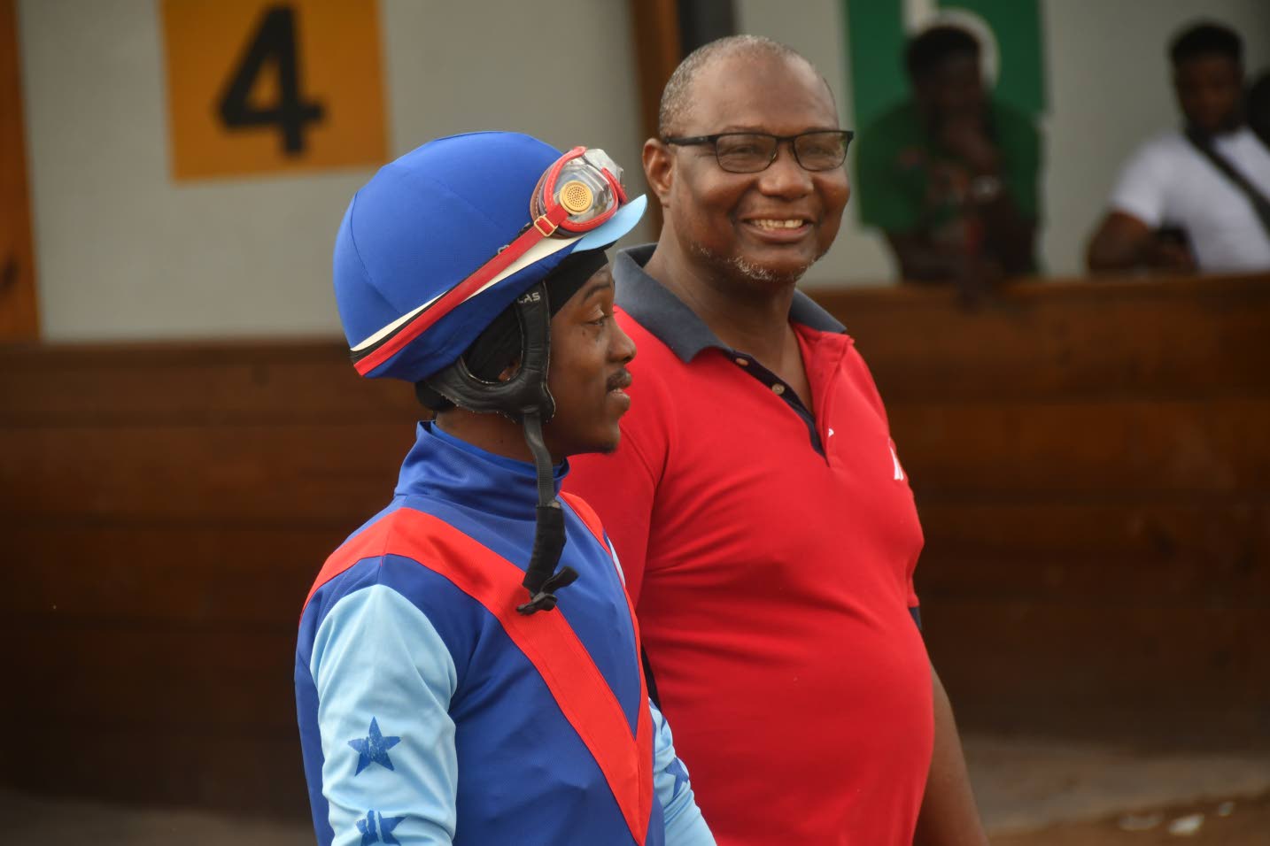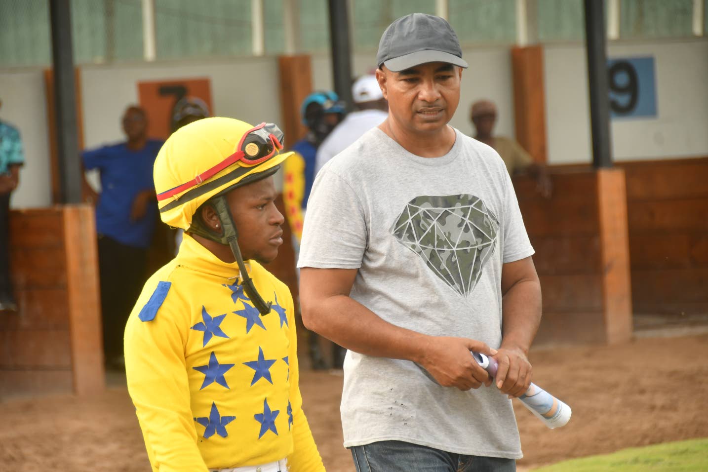 Trainer Oral Hayden (right) and jockey Javaniel Patterson discussing riding strategies. Garfield Robinson