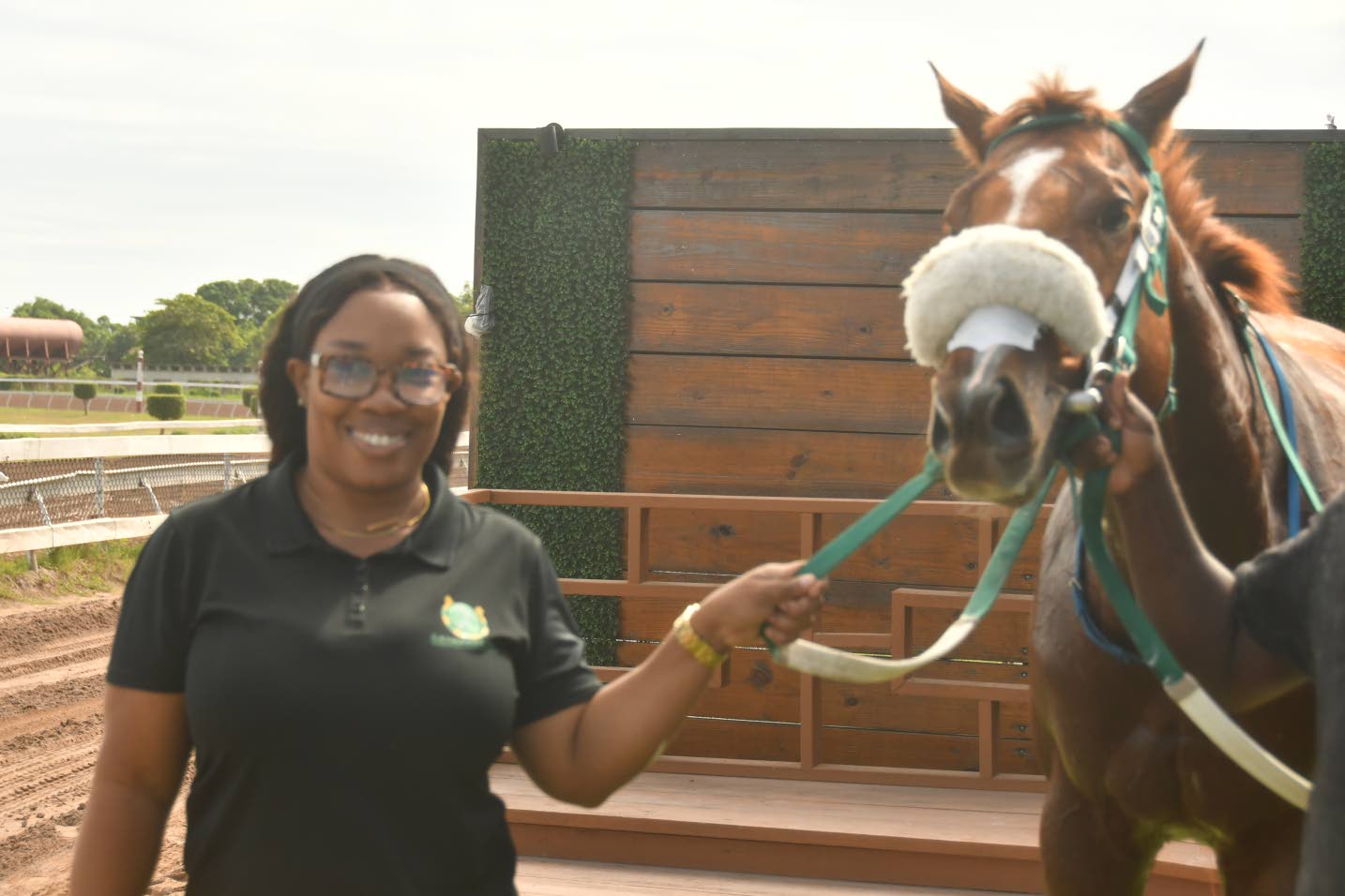 Keisha Brown, winners’ enclosure presentation coordinator, having her winning moment with Successful Man. Garfield Robinson