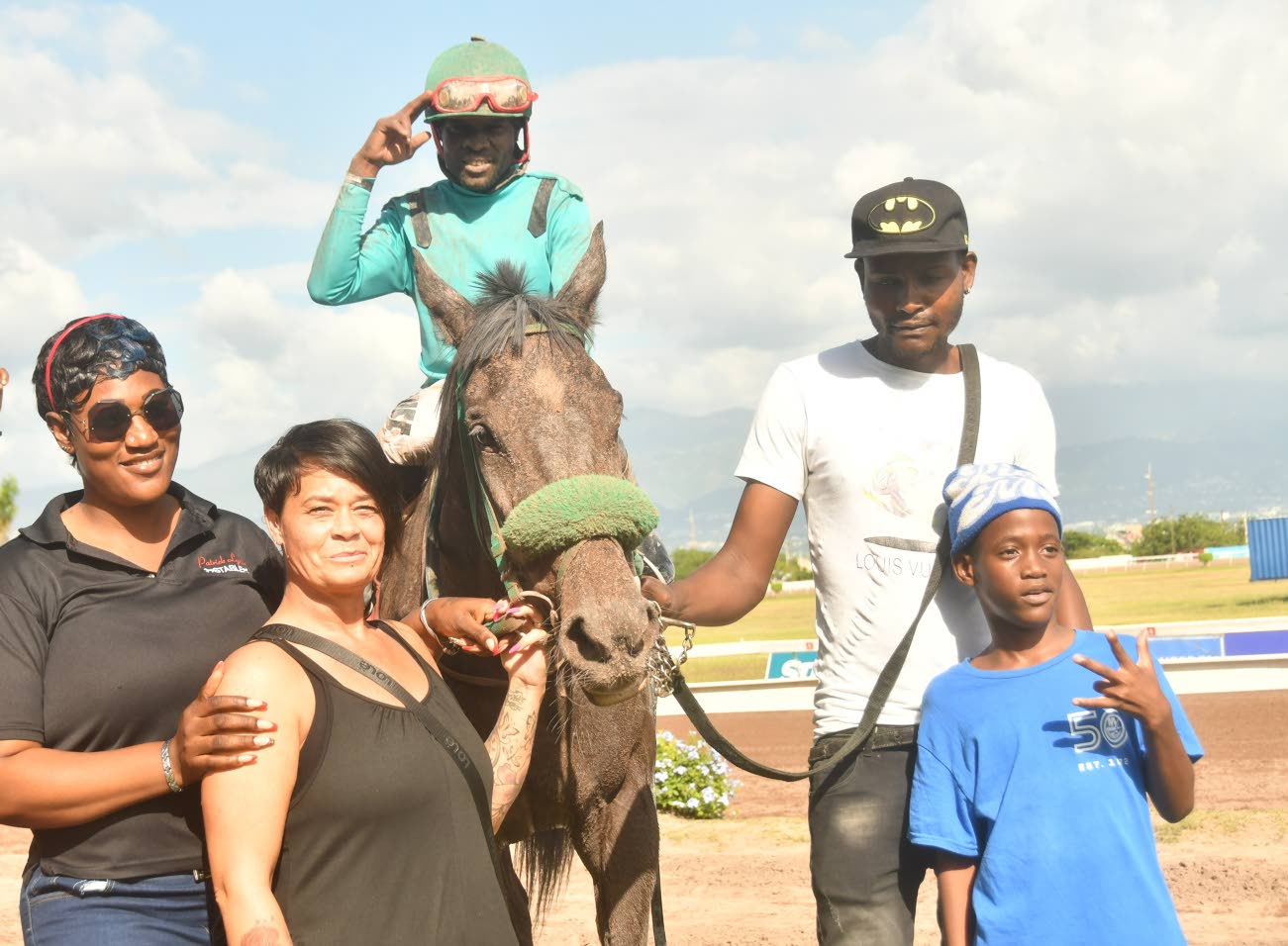 Trainer Kibbeisha Little (left), Dane Nelson’s wife Christina (second left) and other connections celebrate the win by the Patrick Lynch-conditioned Wicked Cassie (Dane Nelson).Garfield Robinson