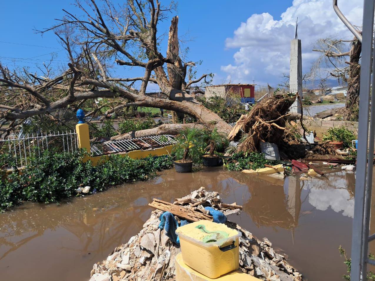 A fallen tree, flood waters and debris outside the Auglo Senior Living Nursing Home in Black River, St Elizabeth, moments after the passage of Hurricane Melissa.