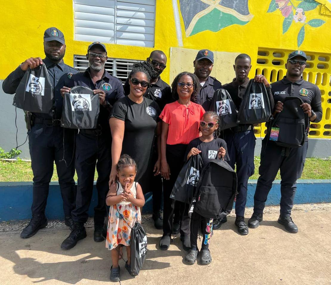 Back row (from left) are Sergeant Charles Campbell, Corporal Alfred Shippy, Constable David Bernard, Constable Damion Wilson, Constable Darnel Donald, Constable Ruhane Virtue from the police force’s Marine Department, which was instrumental in getting the Wilsons’ house repaired. They provided labour when the contractor employed had a challenge getting his team on the ground as they were helping others impacted by the storm. In the front row (from left) are little Naje Wilson; Jhoenea Wilson; Nichol Jackson, principal of Mount Airy Primary and Infant School, along with six-year-old Kadeea Wilson.
