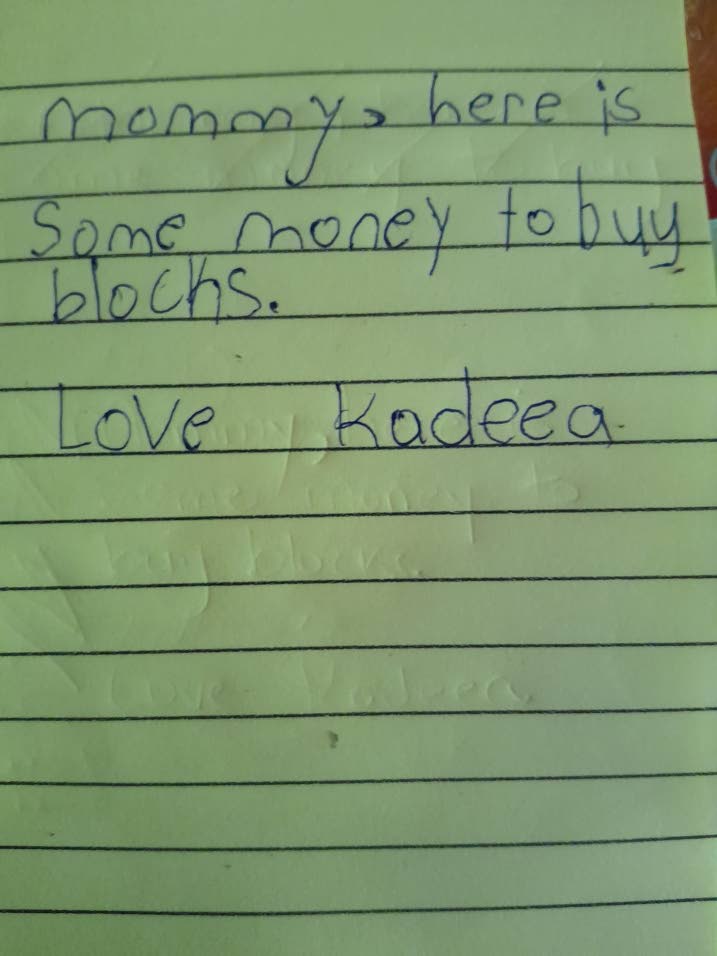 “Mommy, here is some money to buy blocks. Love, Kadeea,” it read.