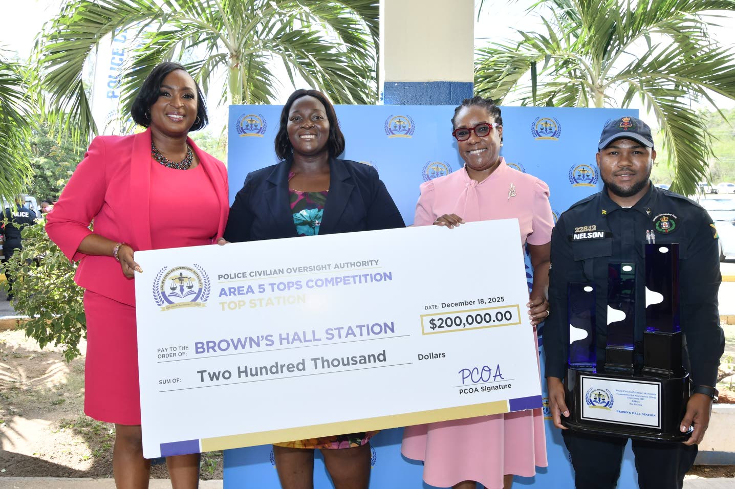 Chief executive officer of the Police Civilian Oversight Authority Otarah Byfield-Nugent (left) and permanent secretary in the Ministry of National Security and Peace Alison Stone-Roofe (second right) present a $200,000 cheque to Sergeant Natoya Mighty, station commander for the Brown’s Hall Police Station which copped the Top Station Award in the Area 5 TOPS competition. Sharing the moment is Constable Kevaughnie Nelson from the Brown’s Hall Police Station, holding the winning trophy.