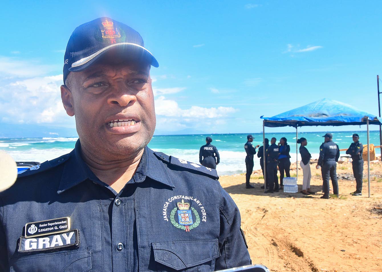 Senior Superintendent of Police Leighton Gray speaking with the Jamaica Observer at Sand Hills Beach in Hellshire, St Catherine, on Friday as rescuers search for a police constable and a 13-year-old boy who are believed to have drowned there on Thursday afternoon.