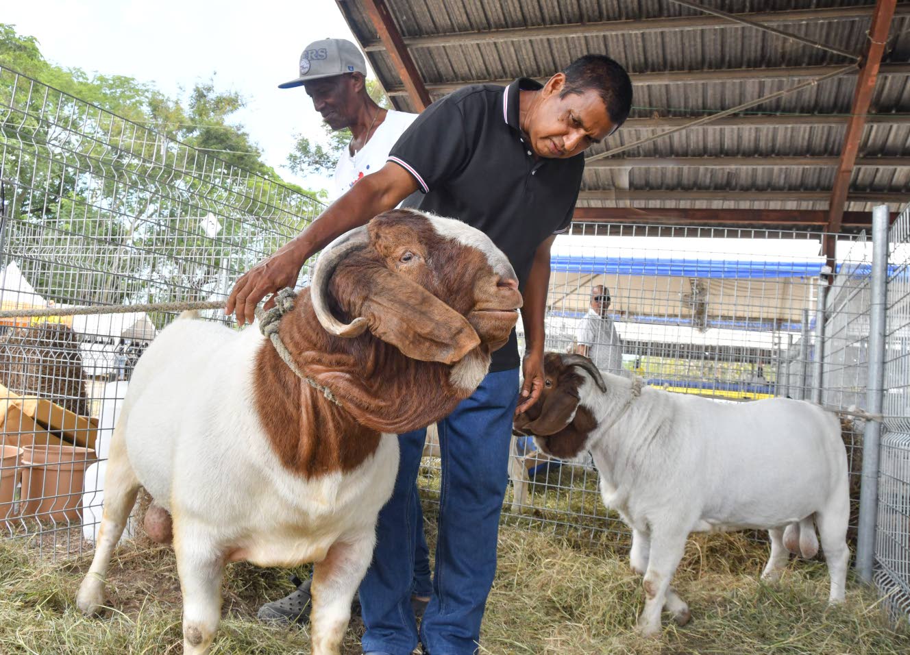 Shenley Williams (right), owner of Suncrest Farm, and Joseph Durrant inspect a two-year-old Boer goat at the Denbigh agricultural show in May Pen, Clarendon, on Friday, August 1, 2025. Agriculture Minister Floyd Green says the National Small Ruminant Development Programme, launched in August 2021, is geared towards rapidly increasing the population of primarily goat and sheep. (Photo: Naphtali Junior)