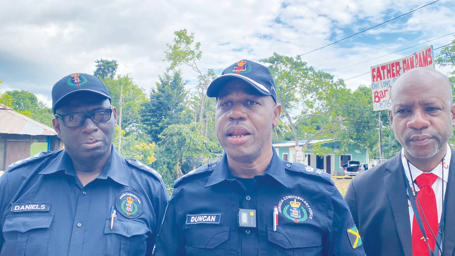 Head of the Manchester police Superintendent Carey Duncan (centre) is flanked by Operations Officer Deputy Superintendent Luhas Daniels (left) and Crime Officer Deputy Superintendent Dennis Simpson during an interview on Monday in St Toolies, Manchester.Photos: Kasey Williams