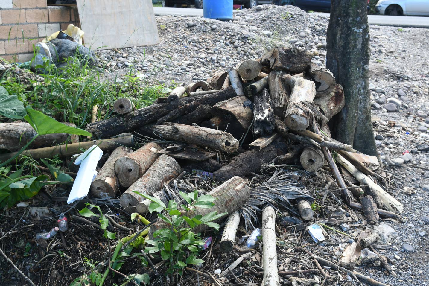 Samuels pointed to tree branches and sticks she and her neighbour pulled from the drains that were now in a pile in front of her house, stating they were more than likely the cause for the build-up of water.
