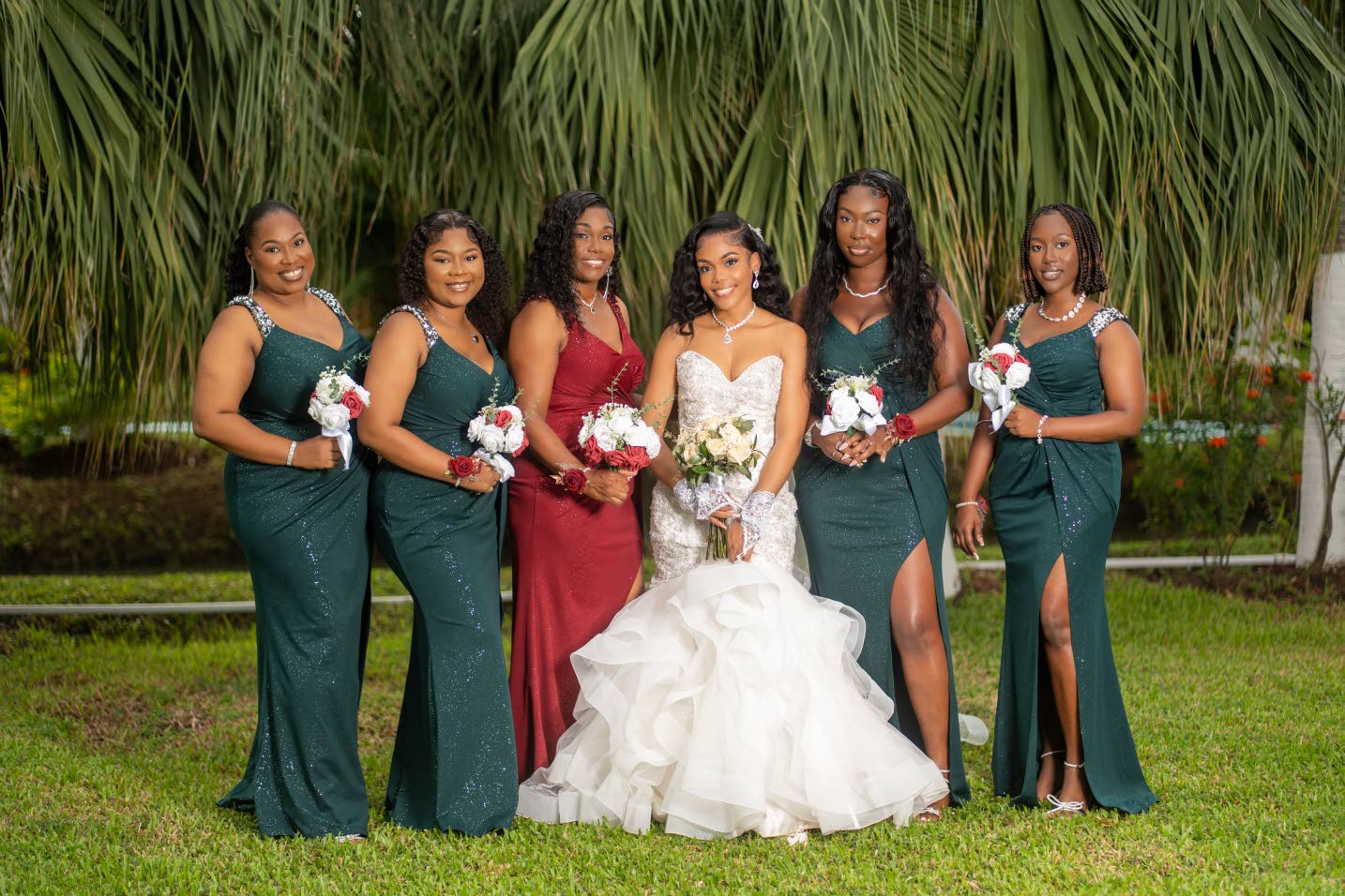 Janel (third right) shares a moment with her bridesmaids (from left) Shanille Bennett-Edwards, Cheree-Ann Bennett, maid of honour Semarta Anderson Brown, Kerry-Ann James and Debrina Nelson. (Photo: Jason Whyte)