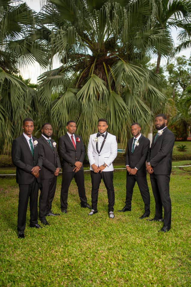 Dane (third right) and his groomsmen (from left) Ricardo Bryan, Dalton Rowe, best man Ian Bennett Jr, Oshane Robinson and Danovan Noble step out in style. (Photo: Jason Whyte)