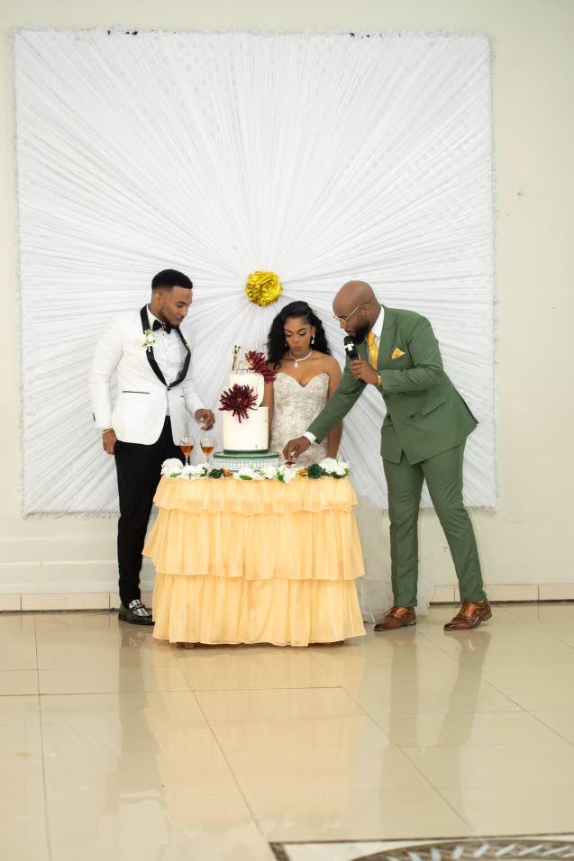 With master of ceremonies Jason Brown (right) guiding proceedings, Janel and Dane prepare to cut their two-tiered vanilla and red velvet cake courtesy of Trinity Club. (Photo: Jason Whyte)