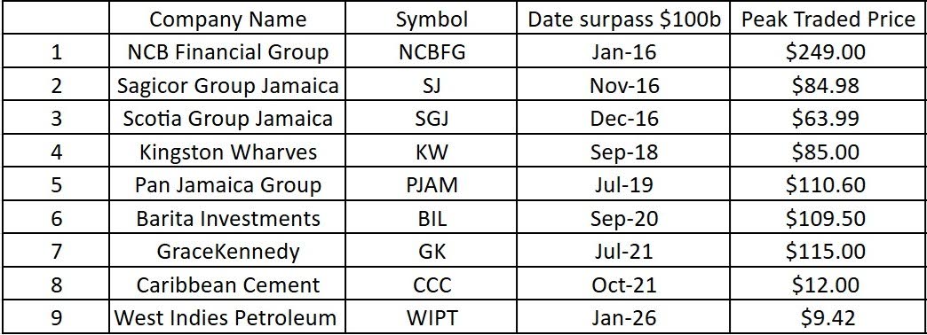Sagicor Group Jamaica Limited (SJ), Kingston Wharves Limited (KW), Pan Jamaica Group Limited (PJAM), Barita Investments Limited (BIL), GraceKennedy Limited (GK) and Caribbean Cement Company Limited (CCC) all surpassed the $100-billion market capitalisation threshold at some point. Guardian Holdings Limited (GHL) and Massy Holdings Limited, which both listed by introduction, both surpassed $200-billion in market capitalisation after listing by introduction.