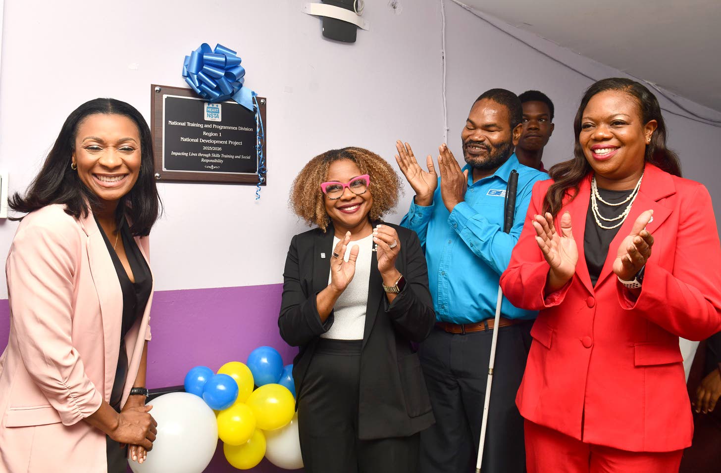 Minister of Education, Skills, Youth and Information, Senator Dr Dana Morris Dixon (third right) unveils the plaque for the HEART/NSTA Trust Region 1 National Development Project during the handover ceremony at the Jamaica Society for the Blind in Kingston, on Thursday. Sharing in the moment (from left) are managing director of the HEART/NSTA Trust, Dr Taneisha Ingleton; chairman of the Jamaica Society for the Blind, Damion McLean; and regional director for HEART’s Region 1, Dr Sasha Shim-Hue.Naphtali Junior