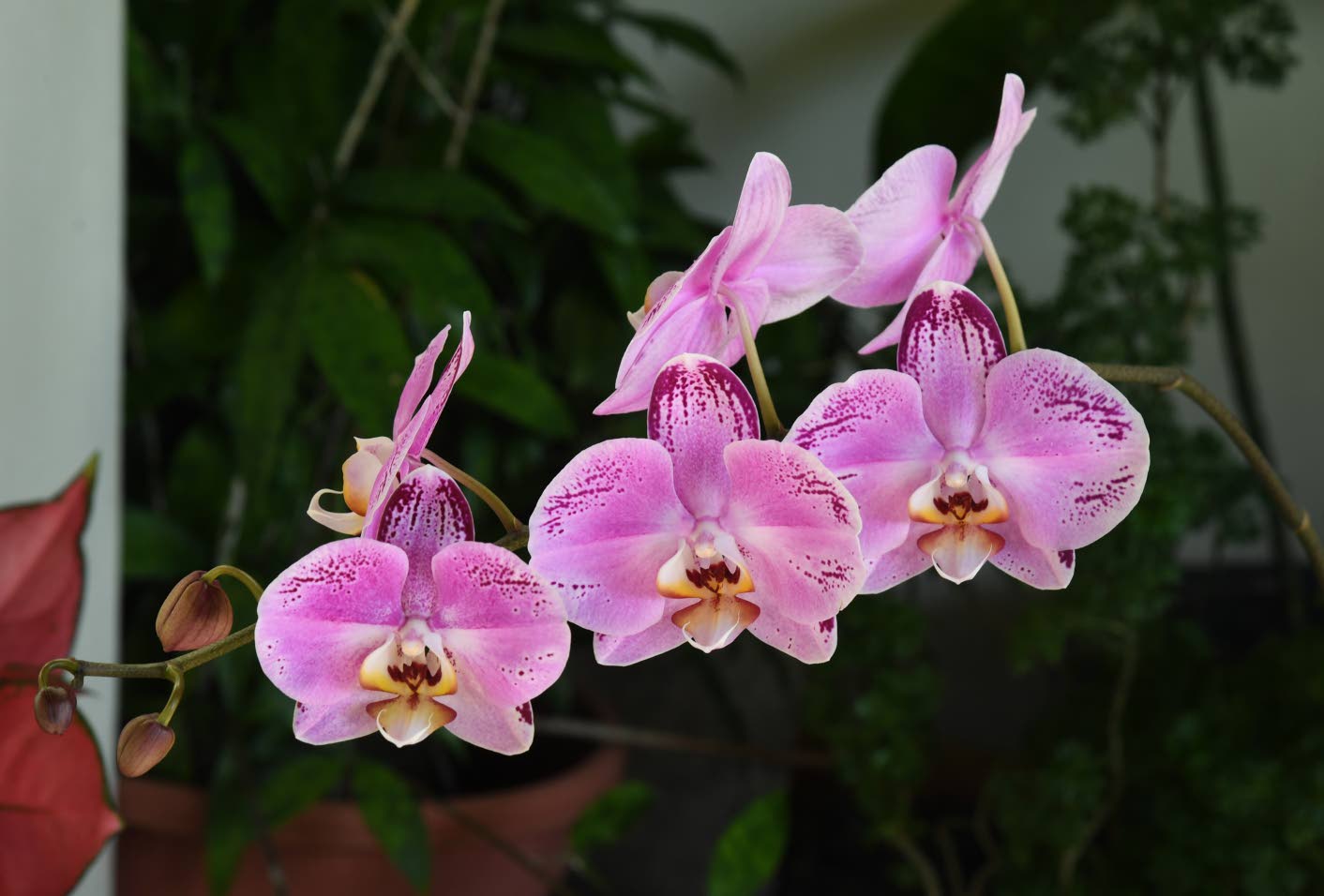 The enchantment begins at the driveway, where a vibrant corridor of sun-drenched and shaded vandas lines one side, complemented by a lush greeting of crotons on the other. This is merely a prelude to the four-tiered masterpiece Sterling has cultivated. The first level showcases a delicate mix of phalaenopsis, dendrobiums, bromeliads and anthuriums, alongside poinsettias still radiant in their post-holiday glow. Rising to the second level, the collection expands into shaded orchids and garden staples like desert roses, hibiscus, bougainvilleas and a rare gerbera lily. Moving further upward, the path opens onto the botanical heart of the residence at the third level — a patio that blends indoor comfort with outdoor beauty, anchored by a stone fountain and a curated orchid display.