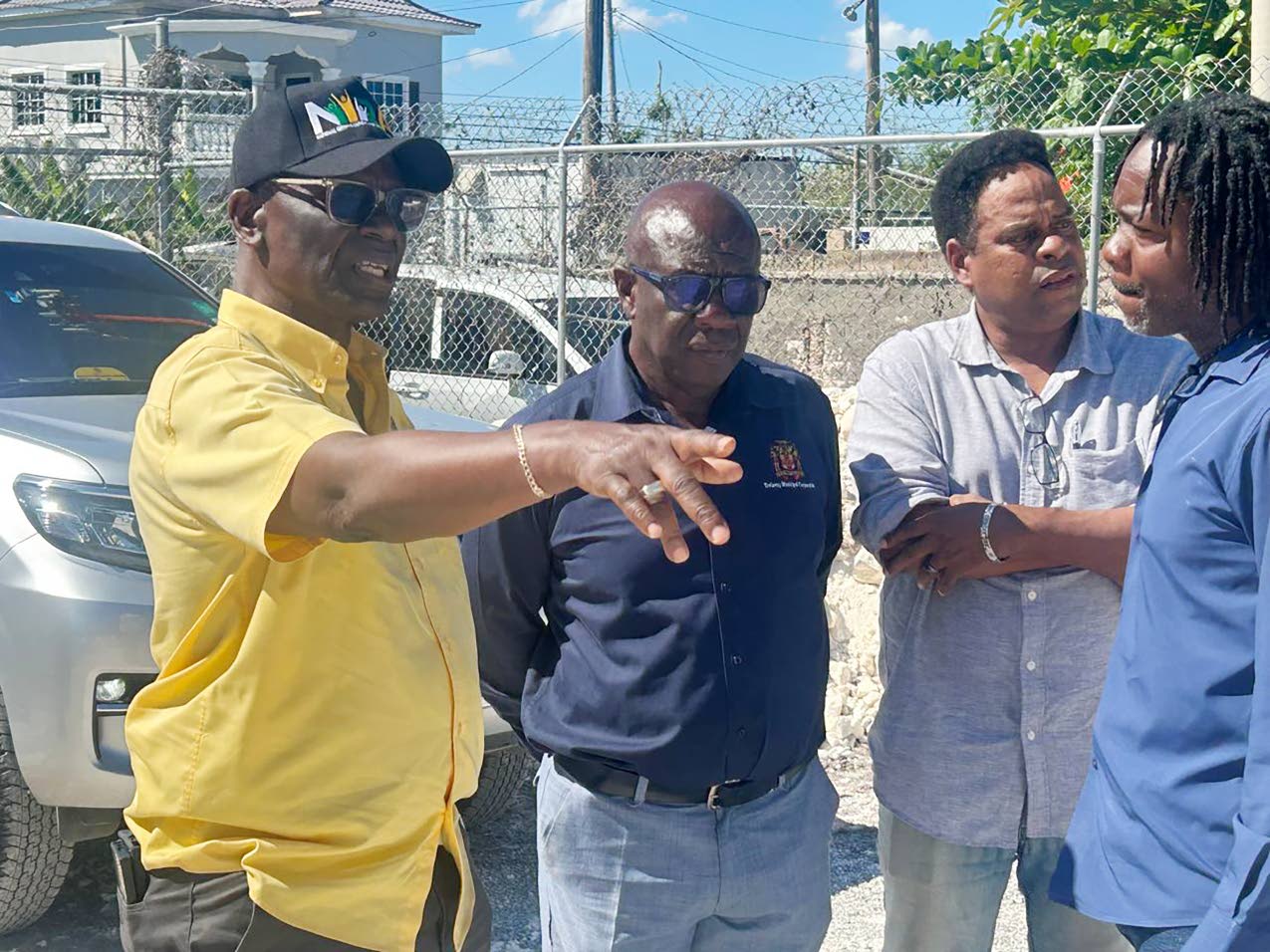 Local Government Minister Desmond McKenzie (left) has the attention of mayor of (from second left) Falmouth, C Junior Gager; chief technical director in the Ministry of Local Government and Community Development Dwight Wilson; and chief engineering officer for the Trelawny Municipal Corporation Kayon Hall, during a recent tour of the site that will house the temporary Trelawny Infirmary in Falmouth. (Photo: Horace Hines)