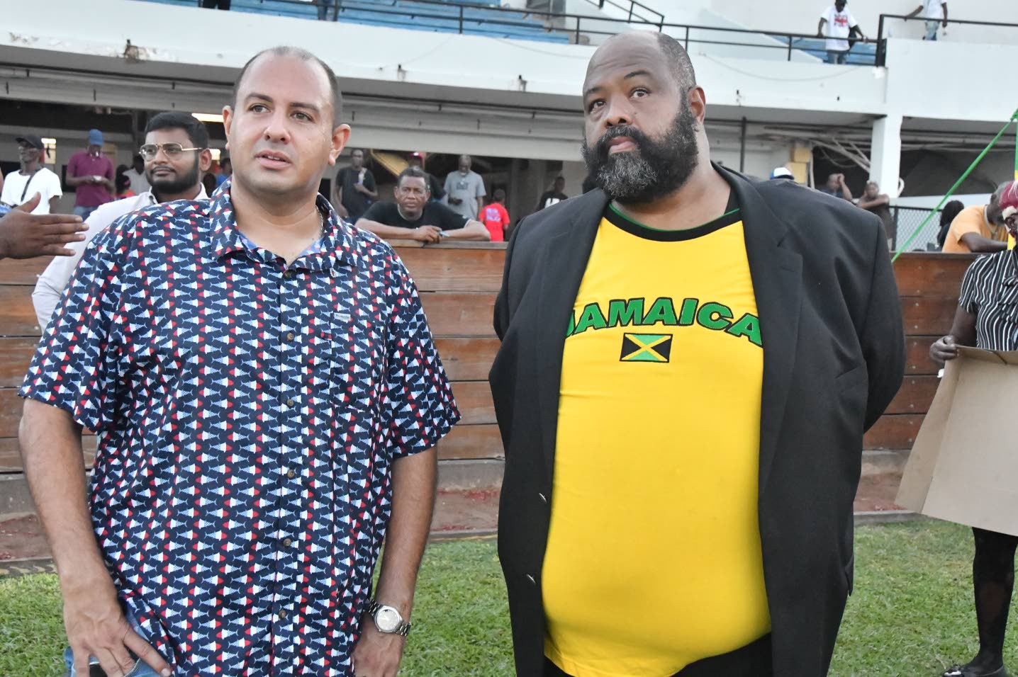 Trainer Jason DaCosta (left) and jockey Robert Halledeen take a moment for themselves in the winners’ enclosure after teaming up with I Dream Again to win the 105th Jamaica Derby Classic at Caymanas Park on Wednesday, August 6, 2025. (Photo: Naphtali Junior)