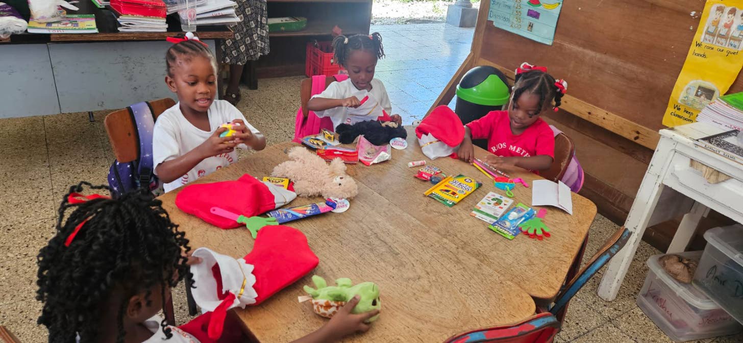 Students at Ocho Rios Methodist Basic School in January unpack Christmas stockings filled with school supplies and toys donated by travel advisers at the Sandals Back to Jamaica Travel Showcase.