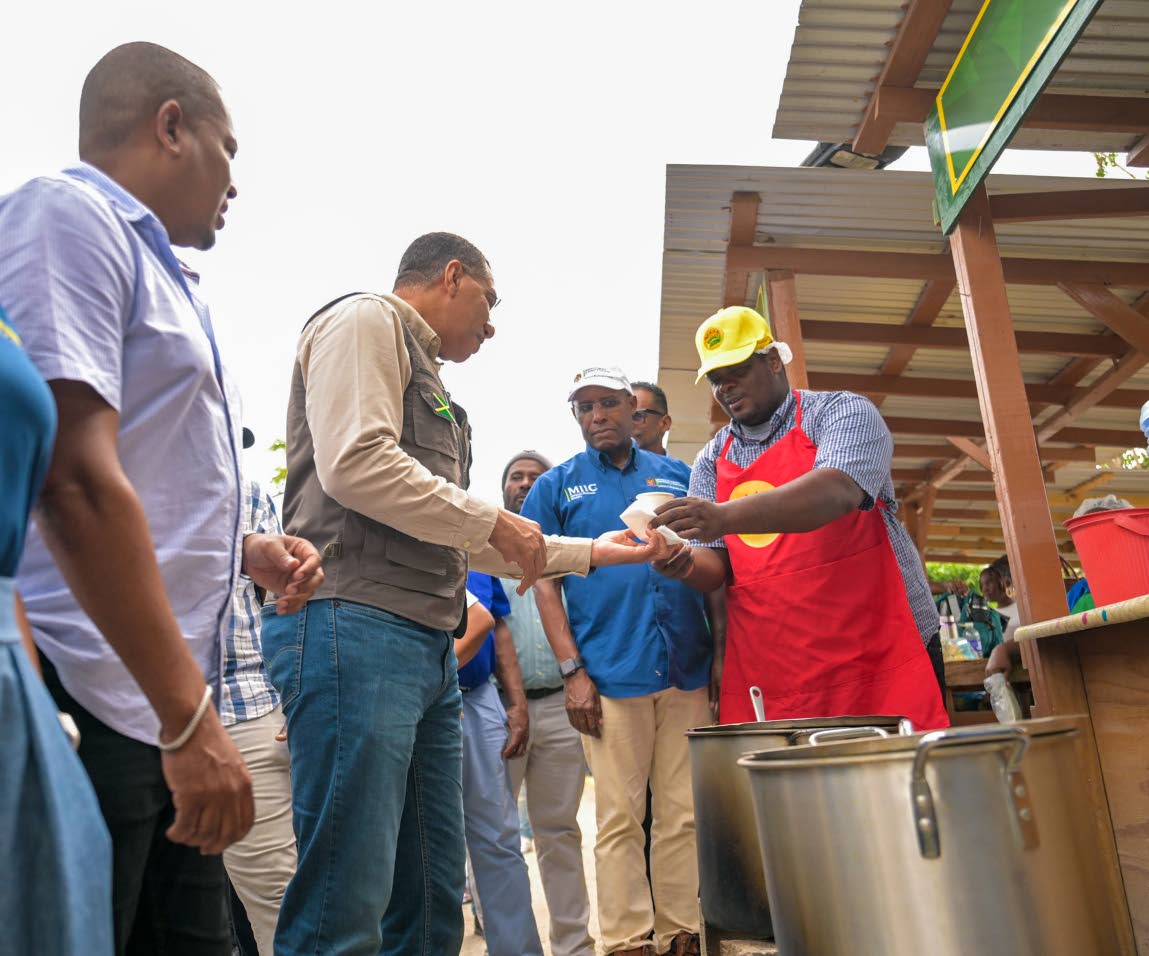 Prime Minister Dr Andrew Holness (second left) is being served a cup of soup by a vendor during the reopening of the rebuilt shops at Border, St Elizabeth, on January 16. Looking on (from left) are Minister of Agriculture, Fisheries and Mining Floyd Green; and Minister of Industry, Investment and Commerce, Senator Aubyn Hill. Photo: JIS