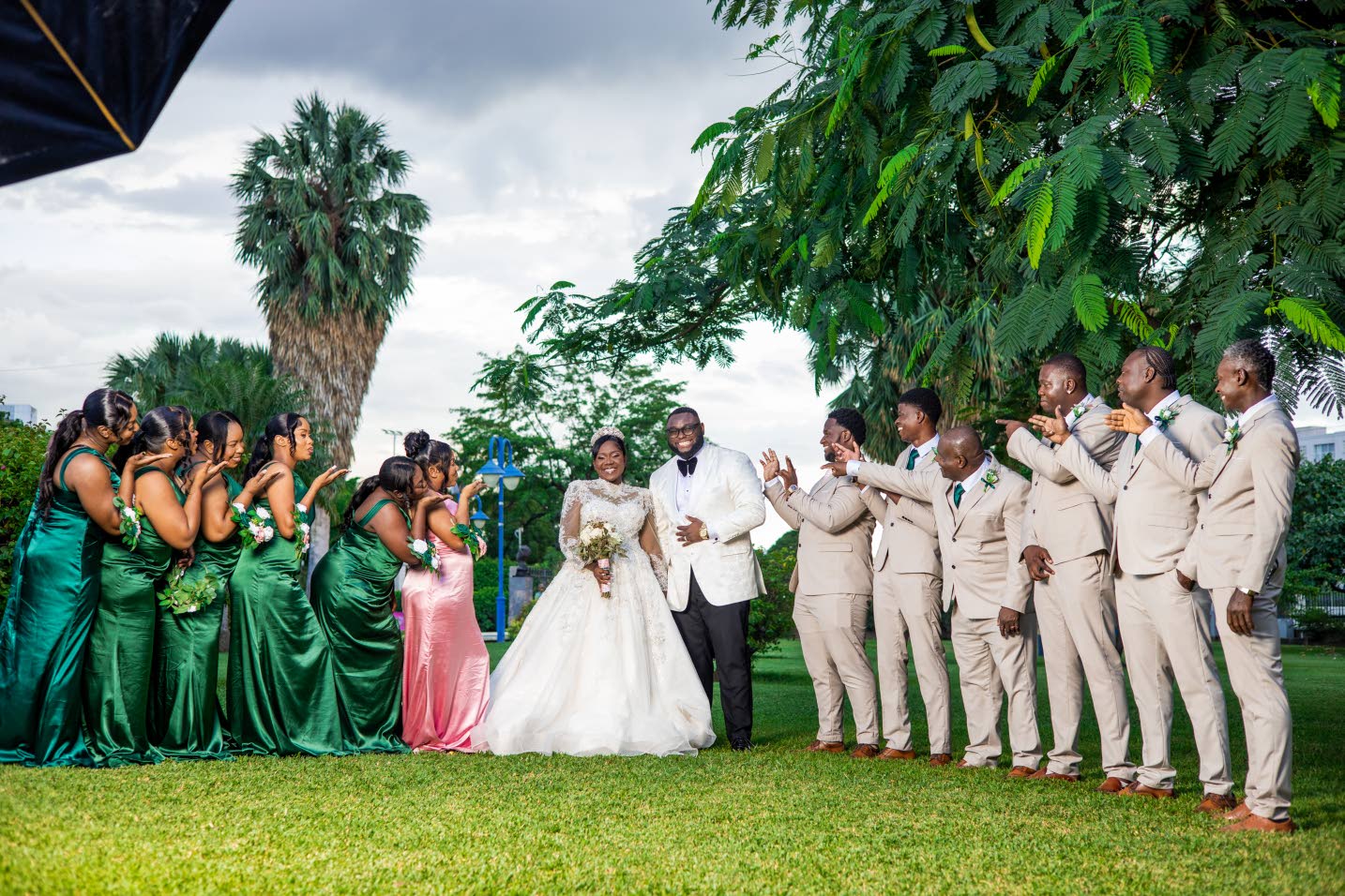Yanique and Stephan share a light-hearted moment with their bridal party. (Photo: Russ Media Photography)
