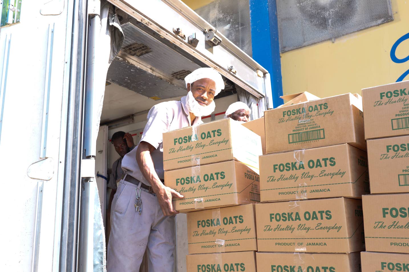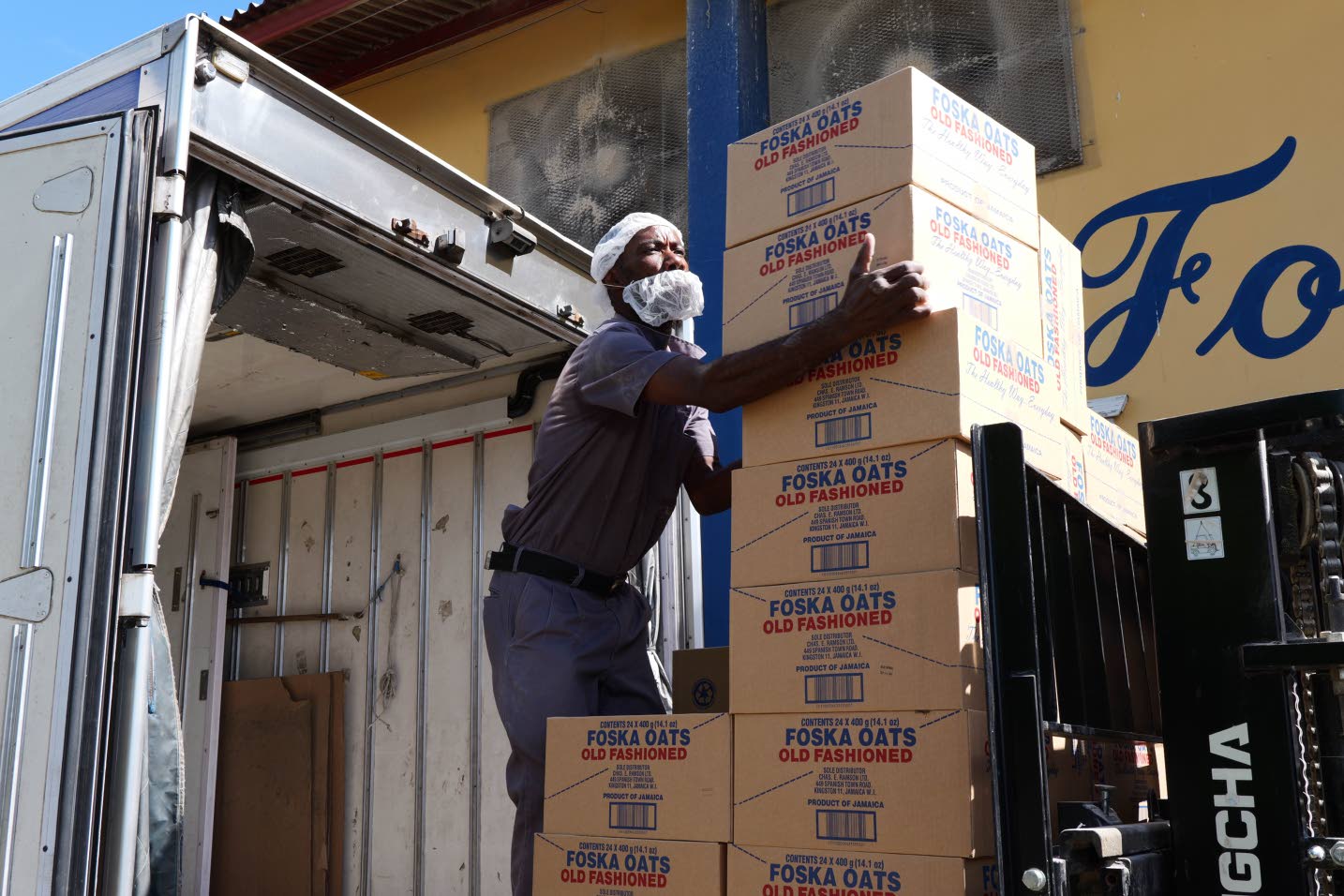 Rushid Vassel assists with loading Foska Oats onto a delivery truck, ahead of distribution to vulnerable communities through Food For The Poor following the impact of Hurricane Melissa.