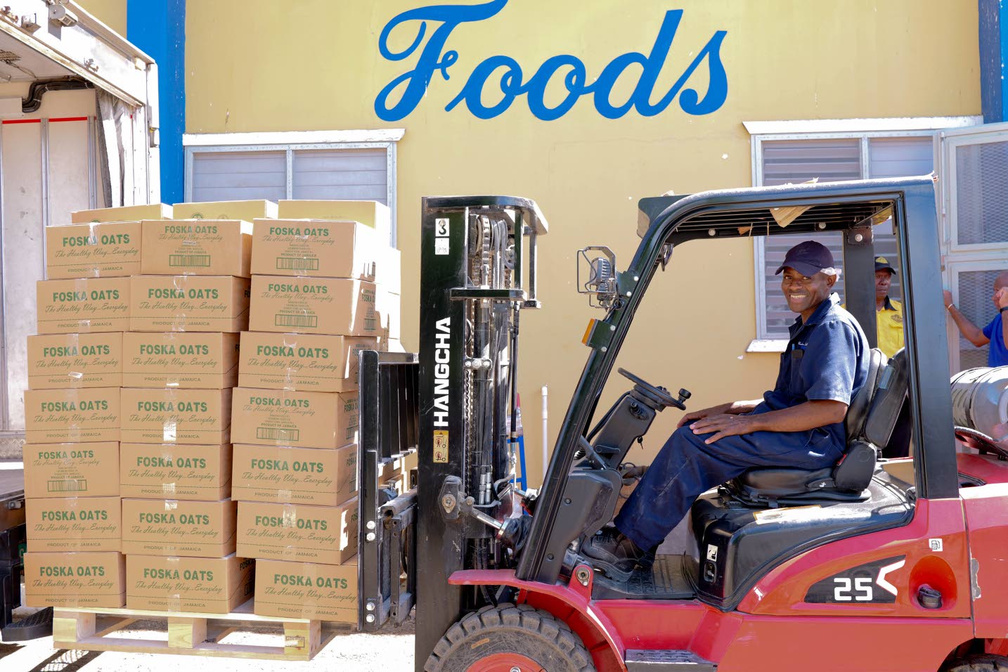 Dumaine Montieth, an employee of Caribbean Foods Limited, loads Foska Oats onto a delivery truck using a forklift..