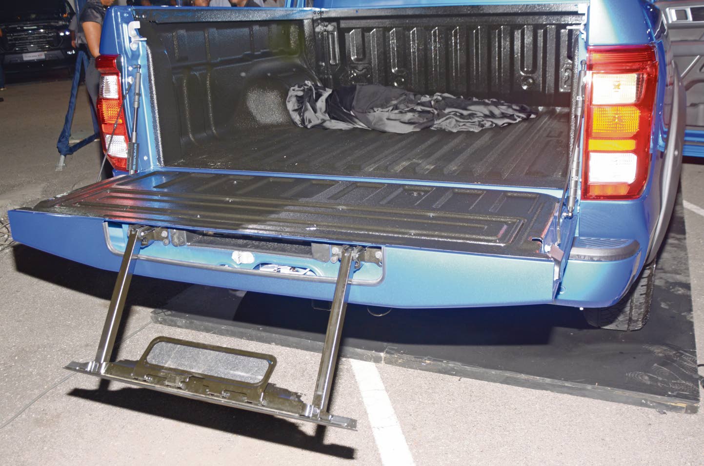 It can handle a full pallet in the protective spray-coated bed and payloads of up to one tonne. It can tow up to 3.5 tonnes. Ground clearance is 240mm, and wading depth is 700mm. Approach and departure angles are 28 and 26, respectively. Break over angle is 21 degrees. Work-related touches are side steps, a damped tailgate, and an auxiliary tailgate step.