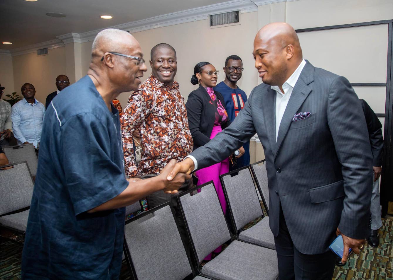 Ahead of proceedings, president of the Ghana Association in Jamaica Dr William Brown (left) greets Minister of Foreign Affairs for the Republic of Ghana Samuel Okudzeto Ablakwa.