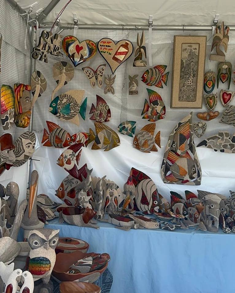 A wide selection of sand-based craft on display at an Irie Arts booth, featuring marine life and nature-inspired designs.