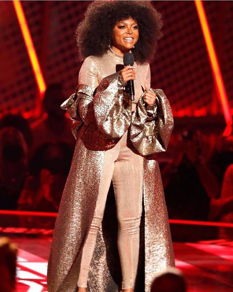 Perennial #GretaGirl Taraji P Henson, dripping in gold custom Greta Constantine while hosting the 2021 BET Awards.