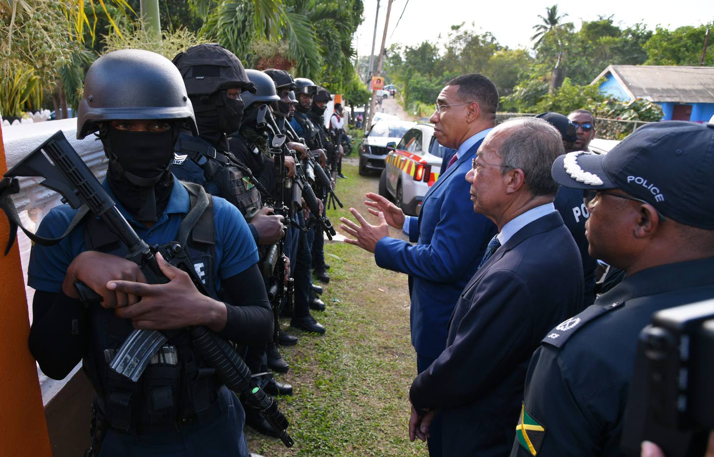 Prime Minister Dr Andrew Holness (third right) is joined by Deputy Prime Minister and Minister of National Security and Peace Dr Horace Chang (second right) as he addresses members of the Jamaica Constabulary Force (JCF) during a visit to the community of Commodore in Linstead, St Catherine, on Monday, October 6. The visit followed a brazen gun attack on a family home in the community during which nine people were shot — five fatally, including a four-year-old child. (Photo: JIS)