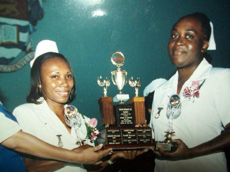 Nurse Cheryl Morgan (left) sharing the trophy for Class Prize with colleague Claudine Witter on the occasion of their graduation from the University Hospital School of Nursing. Both were recruited to work in the United States and have maintained a close friendship. She is also a family nurse practitioner in the USA as well.