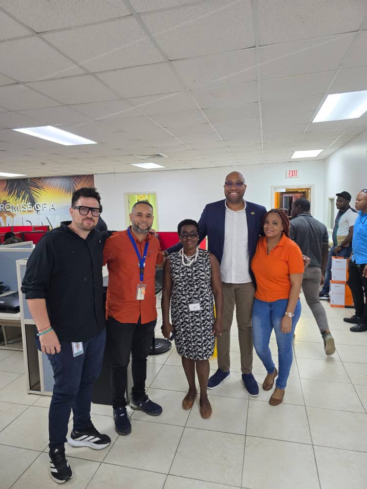 Minister of state in the Ministry of Industry, Investment, and Commerce Delano Seiveright (second right) and Gloria Henry (centre), vice-president BPO & Logistics, Port Authority of Jamaica; take time out of a post-Melissa tour of business entities to snap a picture with members of the management team of BPO company Concentrix (from left) Pablo Rojas Morales, senior director, real estate; Ivan Estevez, senior manager, facility management; and Jada Fennell, senior supervisor, facility management.