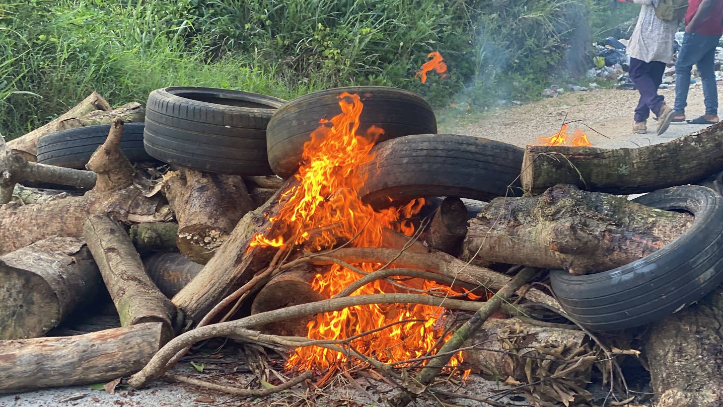 Fire burns amid debris used to block Somerset road in Manchester on Monday. (Photos: Kasey Williams)