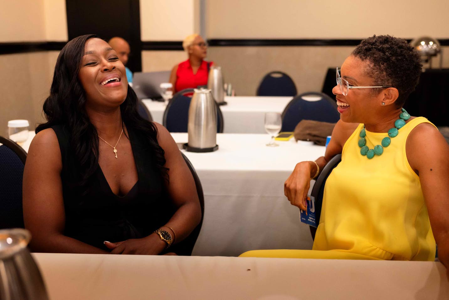 Roxanne Reid (left) of the Bermuda Monetary Authority and Tricia-Gaye O’Connor, attorney-at-law, share a light moment during the recent Build Wealth workshop held at the Pegasus hotel. .