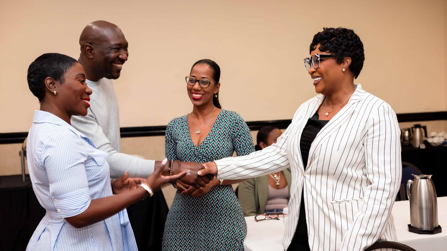 Jermaine Bailey (second left) greets Dr Kesha Christie (right) CEO of KCLH Full Business Solutions at the recent Build Wealth workshop held at The Jamaica Pegasus hotel, where high-network professionals and business owners in attendance had the opportunity to gain in-depth insight into investment strategies for 2026 and strategic tax planning approaches to build and sustain wealth. Also sharing in the photo are Keisha Bailey, CEO of Bailey Wealth Group and Janna-Marie Patel, attorney-at-law. .