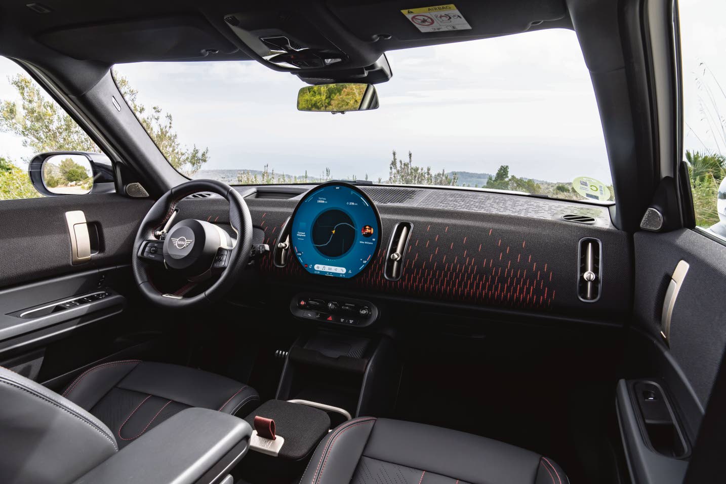 The centrally located 240mm diameter high-resolution OLED infotainment touchscreen mimics the centre-mounted speedometer of the iconic original MINI. From there, the design goes MINI wild. Touches such as vertical air vents, fabric inlays, and stitched leather, coloured accents with the JCW flavour all combine to create what is the automotive equivalent of an open layout.