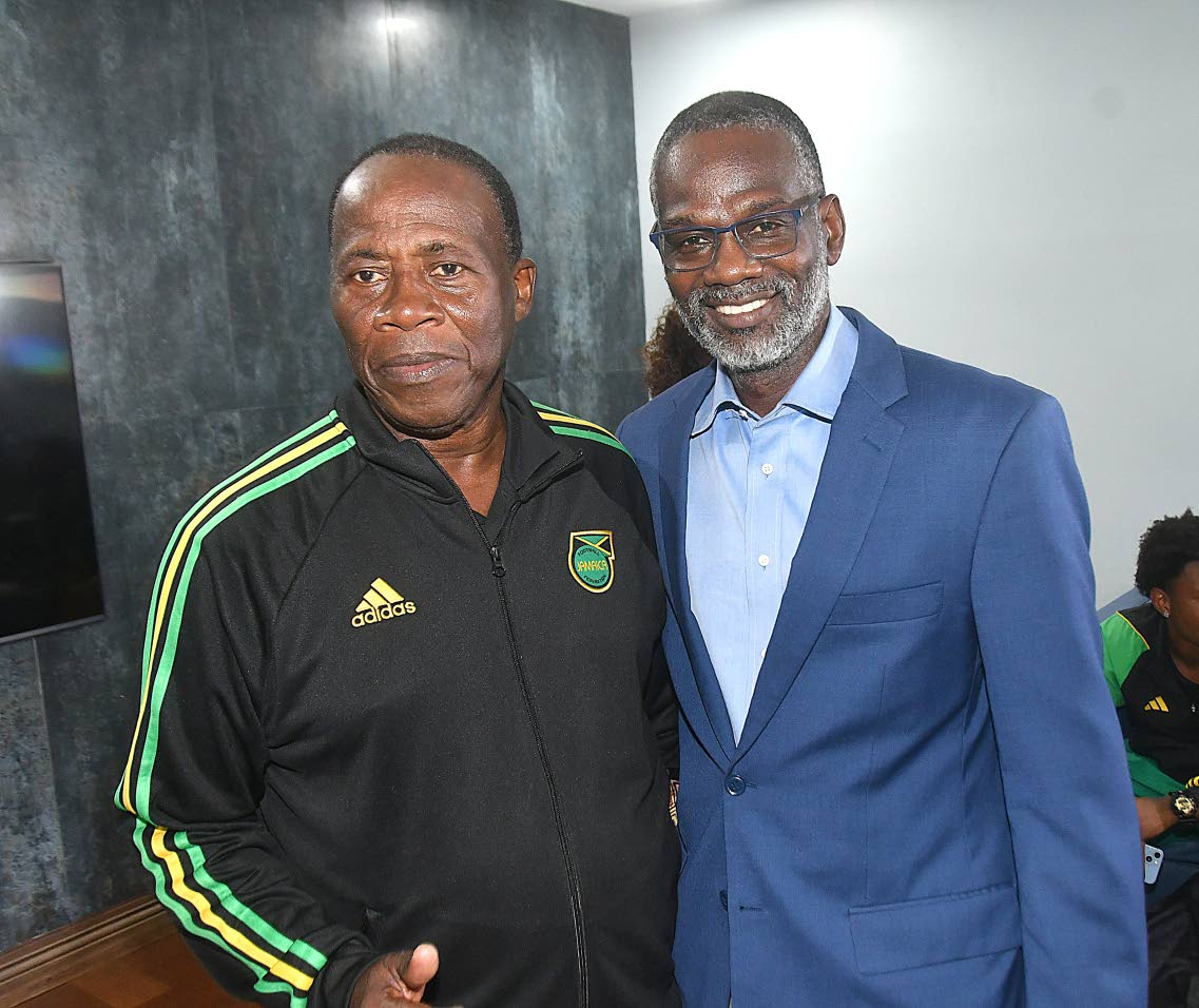 Wendell Downswell (left), head coach of Jamaica’s Under-17 football team; and Denzil Thorpe, permanent secretary in the Ministry of Culture, Gender, Entertainment and Sport, pose during a special reception for the team on their return to the island from the Concacaf Qualifiers in Costa Rica, in the Government VIP Lounge at the Norman Manley International Airport on Thursday.