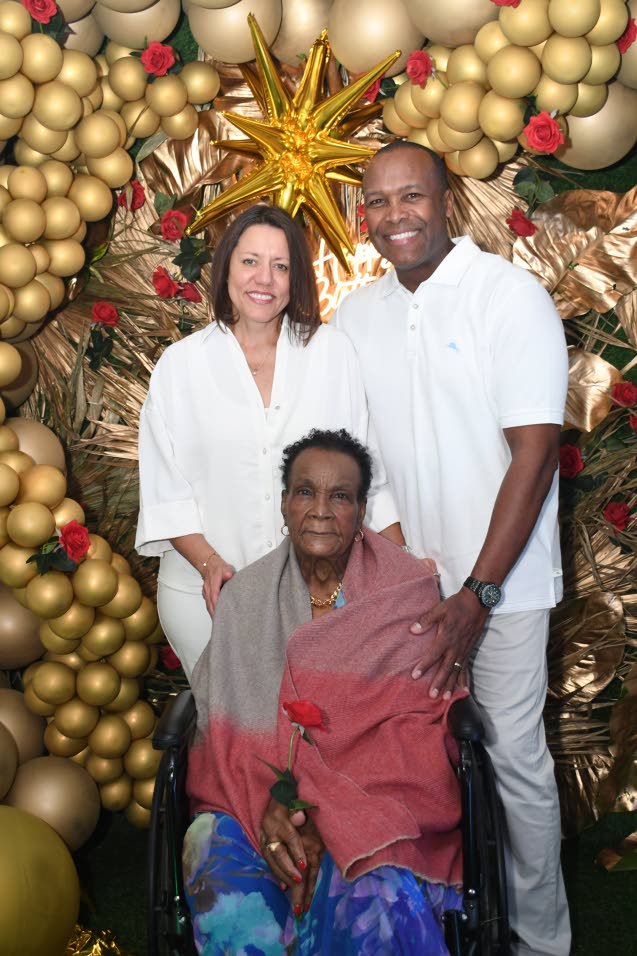 Centenarian Elaine Ingleton (seated) shares the frame with her grandson, retired Air Force Colonel Christopher Ingleton and his wife Cindy.(Photo: Karl Mclarty)