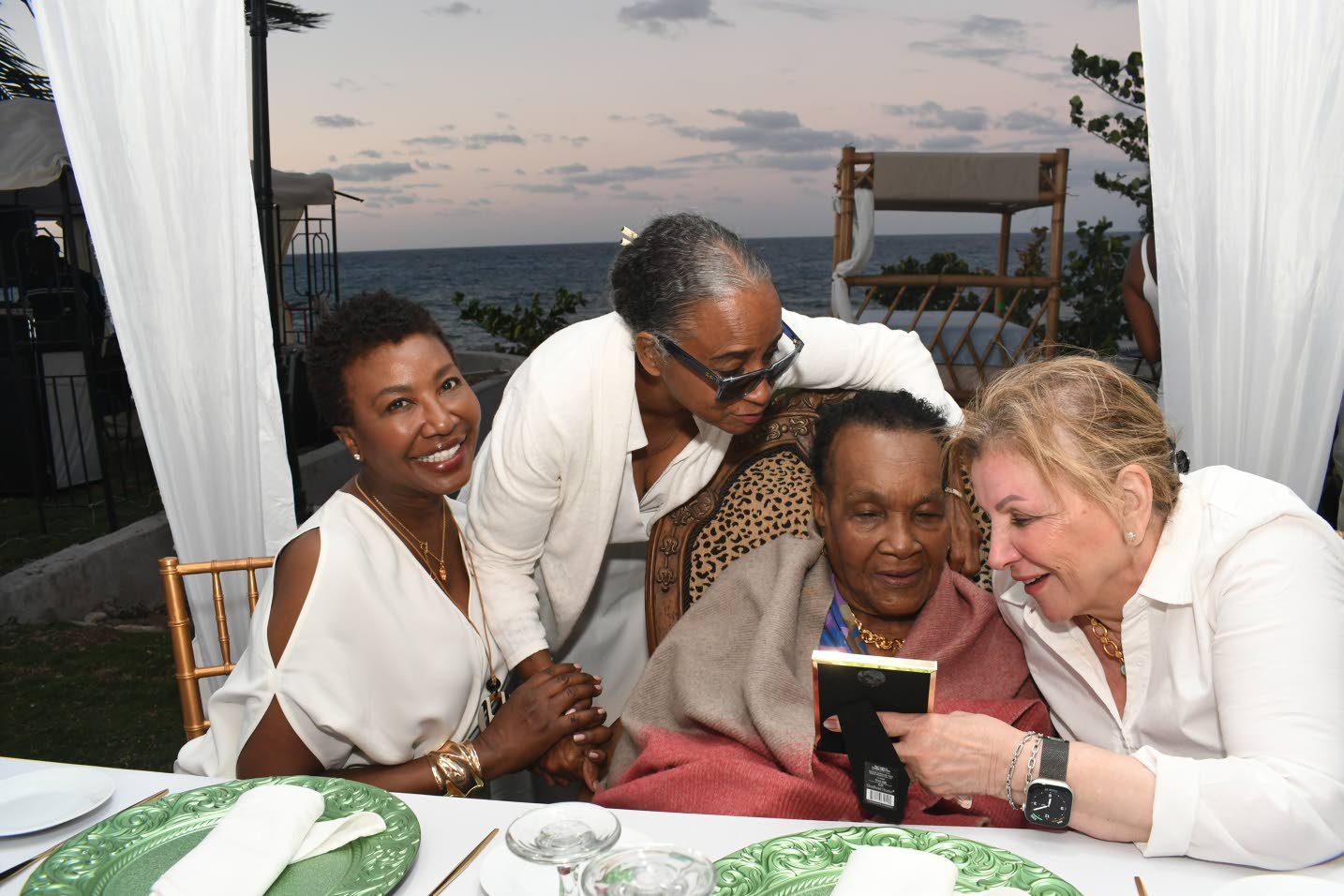 Each table is decorated with framed photographs of Elaine Ingleton (second right) over the years. Here, Ahlam Al-Shibib (right), Dr Rose Ingleton (left) and Elaine’s longtime friend Gay Clunis join the birthday celebrant in admiring one. (Photo: Karl Mclarty)
