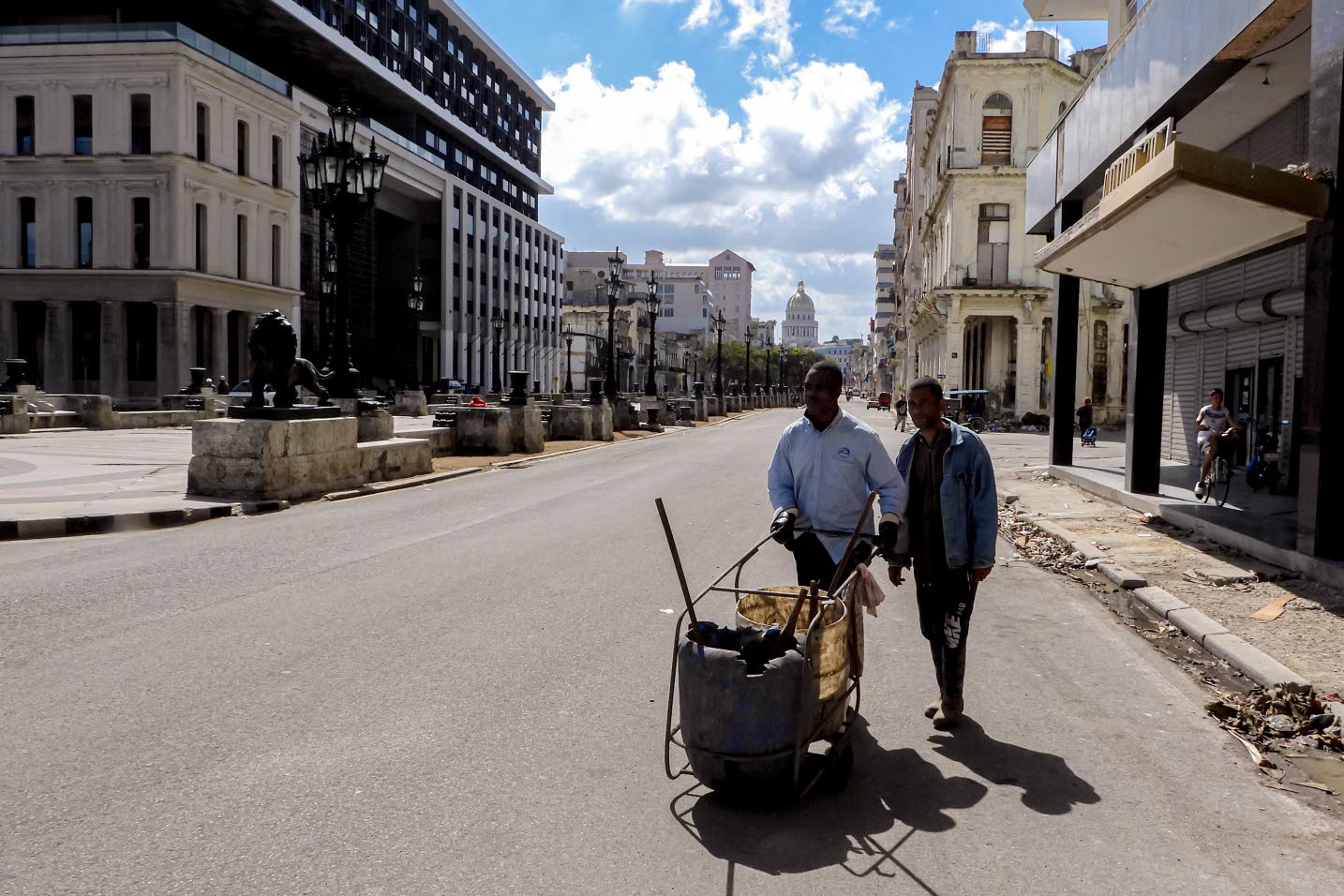 Street cleaners push a cart as they walk along a quiet street in Havana on February 8, 2026. The Cuban Government on February 6 announced emergency measures to address a crippling energy crisis worsened by US sanctions, including a four-day workweek for State-owned companies and restrictions on fuel sales. (Photo: AFP)